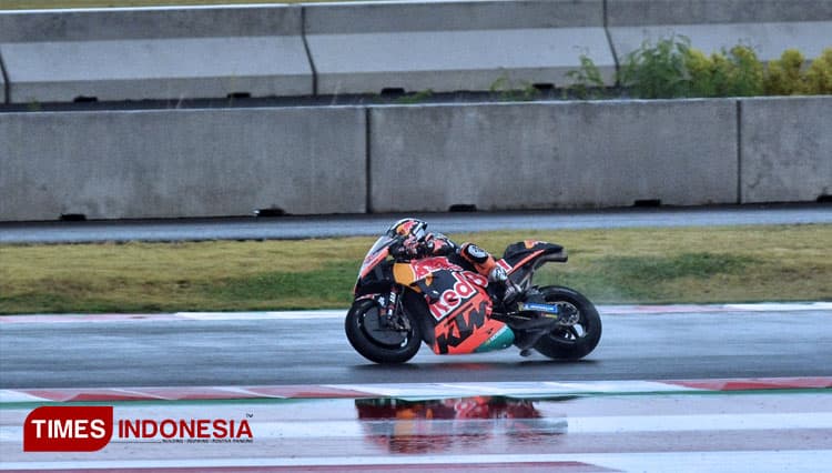 TIMES Toraja/Pembalap tim Red Bull KTM, Miguel Oliveira melahap trek basah Sirkuit Mandalika, saat lomba seri kedua MotoGP di Mandalika, Lombok, NTB, Minggu (20/3/2022). (FOTO: Tria Adha/TIMES Indonesia)
