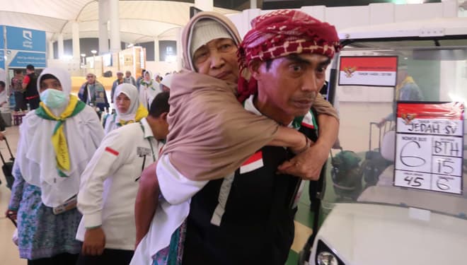 TIMES Toraja/Petugas PPIH menggendong jemaah risti di bandara KAIA Jeddah, jelang pulang ke tanah air. (FOTO : istimewa).
